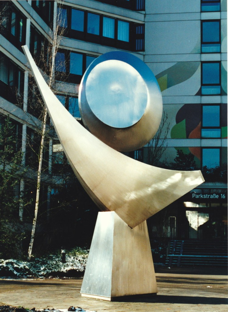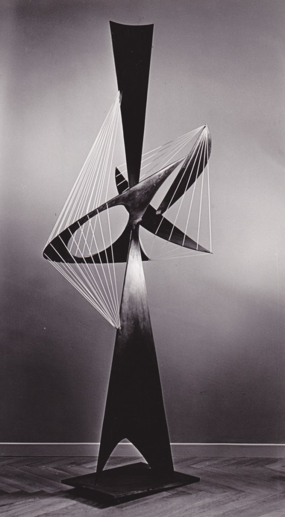 1954 entsteht die erste FREIPLASTIK, entworfen für den Garten des Stuttgarter Architekten, Gustav Schwab. Gebräunte Messingformen mit Drahtverspannungen, in schwebender Balance gehalten.